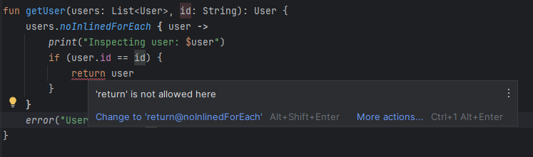 return 구문을 getUsers 함수 내부가 아니라 forEach에 전달된 람다에서 return 구문을 사용한다는것에 주목할 필요가 있습니다. 이것이 가능한 이유는 forEach 함수에 inline 수식자가 사용되었기 때문입니다.