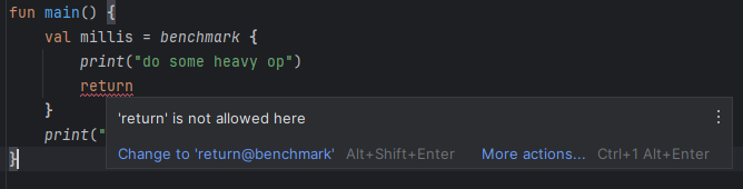 benchmark 함수가 인라인 수식자로 표시되어 있기 때문에 컴파일이 성공적이며, non-local returns를 사용할 수 있습니다.