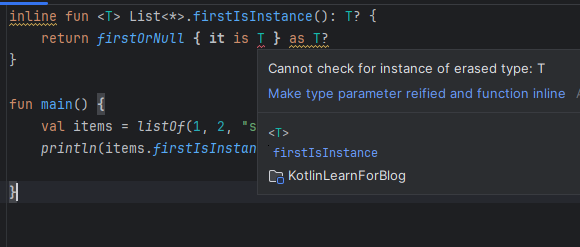 만약, 인라인 함수로 만들었지만 reified 식별자를 붙이지 않으면 어떻게 될까요? 다음처럼 컴파일 에러가 발생하게 됩니다.