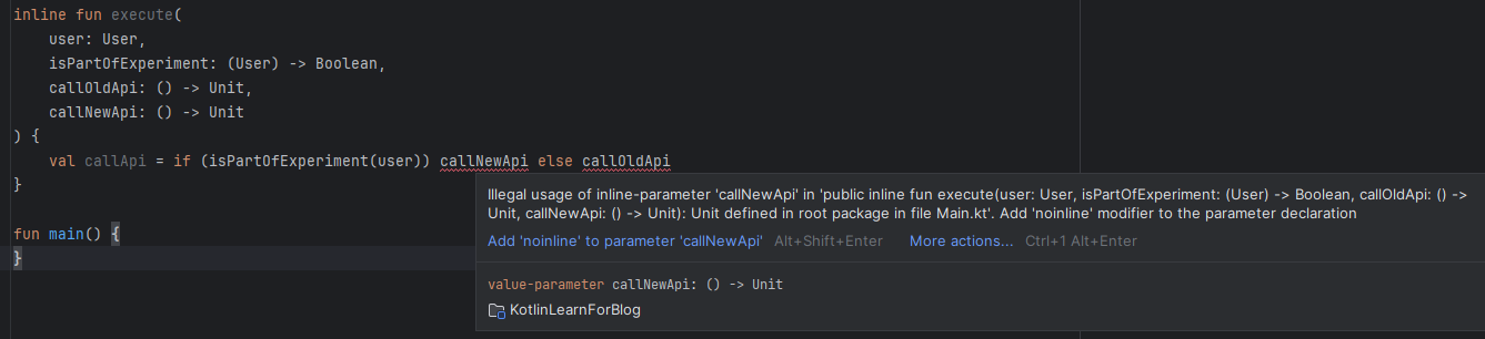 우리는 올바른 람다를 callApi라는 변수에 저장하고 나중에 호출하고 싶지만 그럴 수 없습니다. 위 코드를 작성하면 "Illegal usage of inline-parameter" 에러가 발생합니다. inline 수식어로 인하여 callOldApi와 callNewApi는 더이상 객체가 아니기 때문에 callApi라는 변수에 저장을 할수가 없습니다.