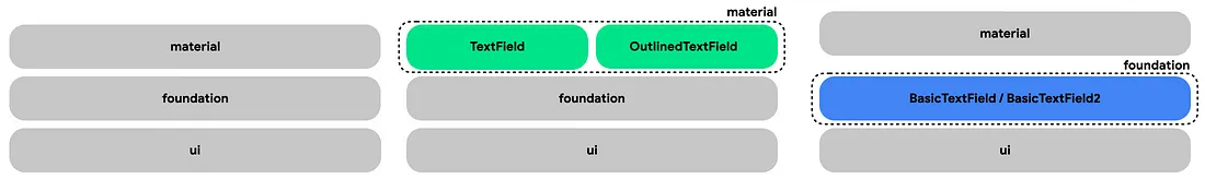 TextField와 OutlinedTextField는 foundations 레이어에 있는 BasicTextField2의 위에서 스타일을 추가 할 수 있는 Material 구성 요소입니다. 이 글에서는 BasicTextField에서 BasicTextField2로 어떤점들이 개선되는지를 중심으로 설명하겠습니다. 참고로, BasicTextField2라는 네이밍은 API가 개발되는 동안에 임시로 사용하는 이름임을 알아주시기 바랍니다.