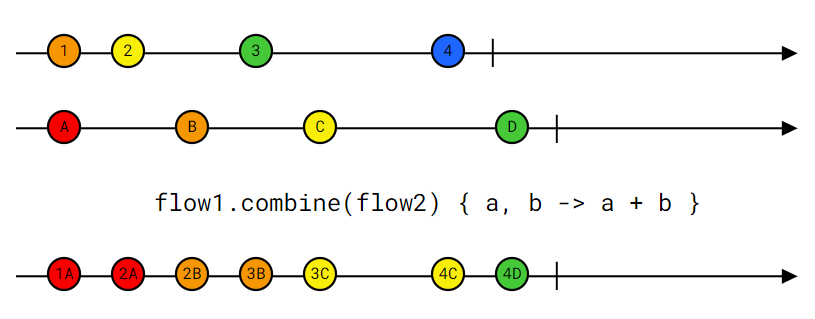 combine(flow1, flow2) { val1, val2 -> val1 + val2 }