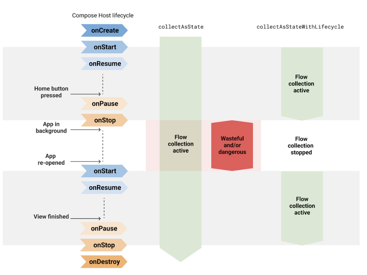 Activity/Fragment의 라이프사이클에 따라 Flow 수집이 어떻게 동작되는지 확인 할 수 있습니다. collectAsStateWithLifecycle로 Flow 수집을 진행하면 화면이 포그라운드 상태일때만 동작합니다. collectAsState와의 차이점 또는 어떤 경우에 사용하는지에 대하여 알고 싶다면 이글을 참조 해주세요.